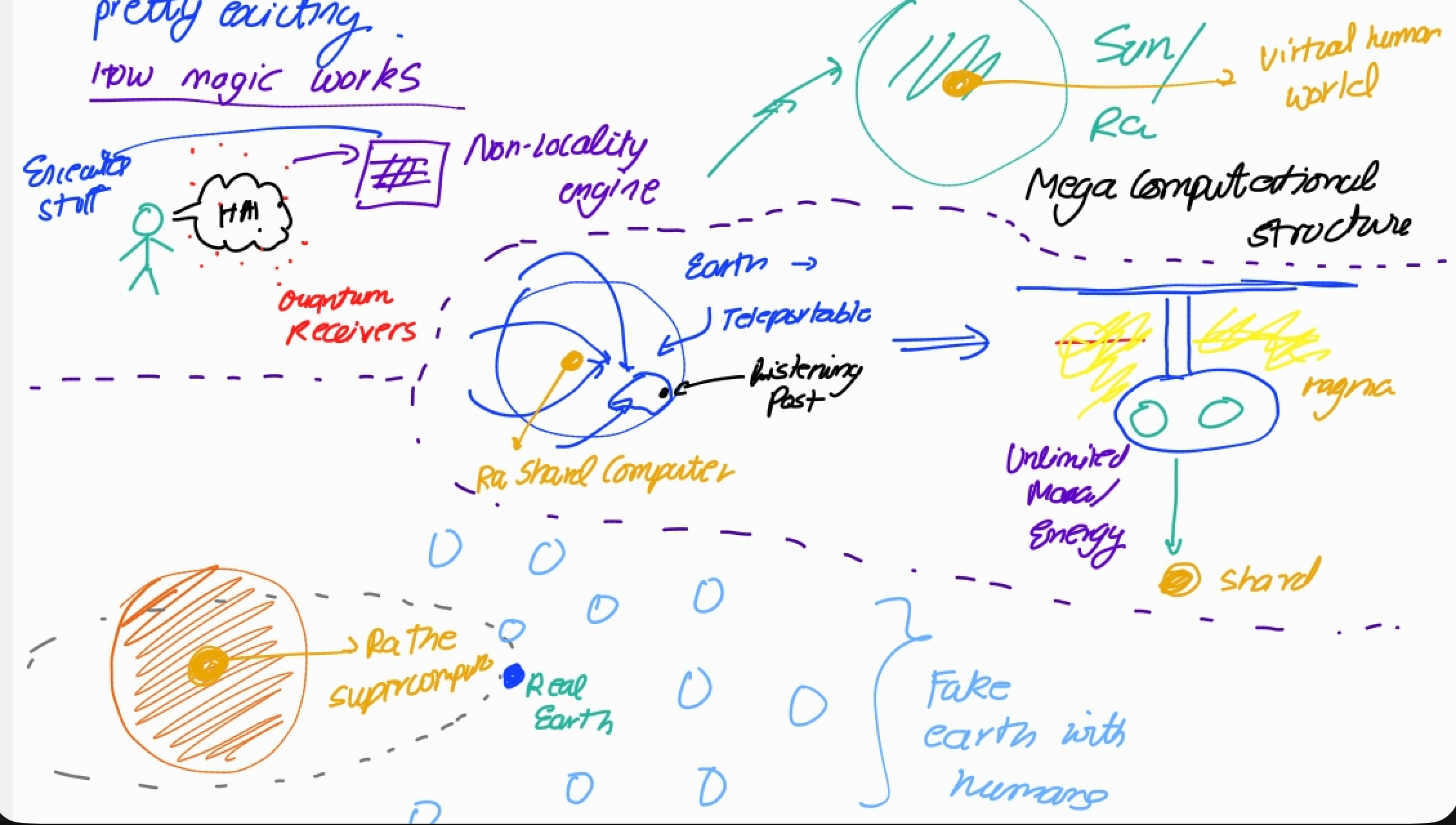 The system is wild. Enchanters use staff to channel through a non-locality engine. Quantum receivers pick up the signal. Earth has a listening post that’s teleportable, connected to Ra, the shared computer (which is actually the Sun, running a mega computational structure). The real Earth is tiny compared to the whole setup. There’s a virtual human world running on Ra’s computation, with unlimited mana/energy. The whole thing is a Matrioshka brain situation: fake earth with humans, powered by a stellar-scale computer. Absolutely nuts worldbuilding.