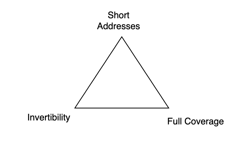 If you want invertibility and full coverage, you lose short addresses. The address must encode enough information to reconstruct the content, which means it grows with the content space.