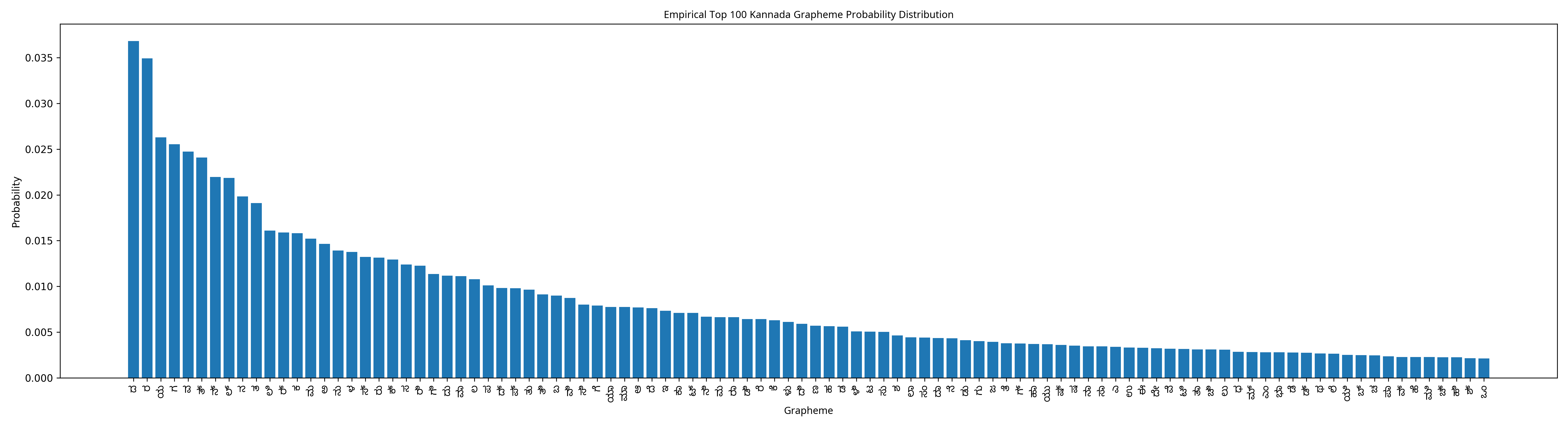Look at that curve. The most common grapheme has a probability of about 0.035 (3.5%), and it drops off steeply. The top 100 clusters account for most of natural Kannada text; the remaining 57,000+ clusters share the scraps.