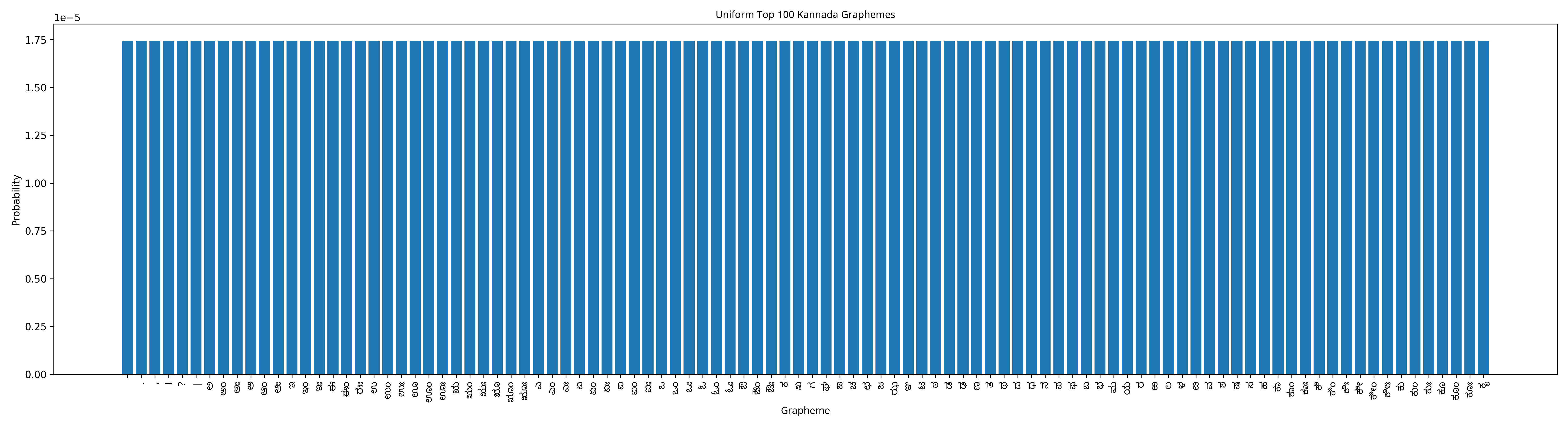Notice the y-axis: 1e-5, or 0.00001. Every single grapheme, whether it’s the ubiquitous ಕ or some obscure conjunct you’ve never seen, has the same probability of roughly 1/57,324 ≈ 0.0000175. The most common cluster in natural text is about 2,000 times more likely than any cluster in the library’s uniform distribution.
